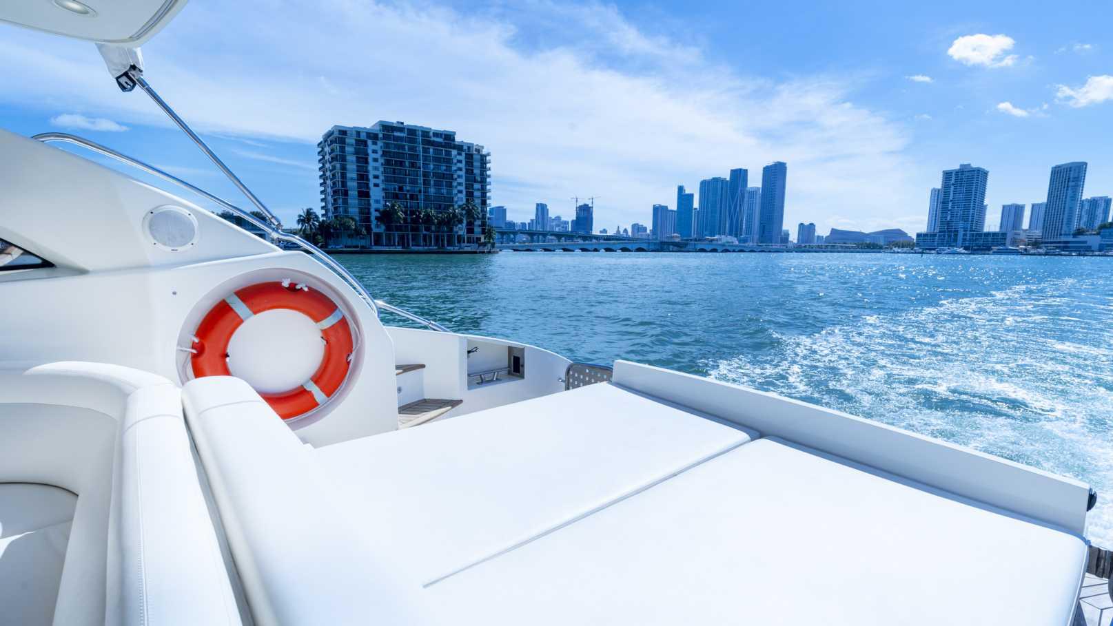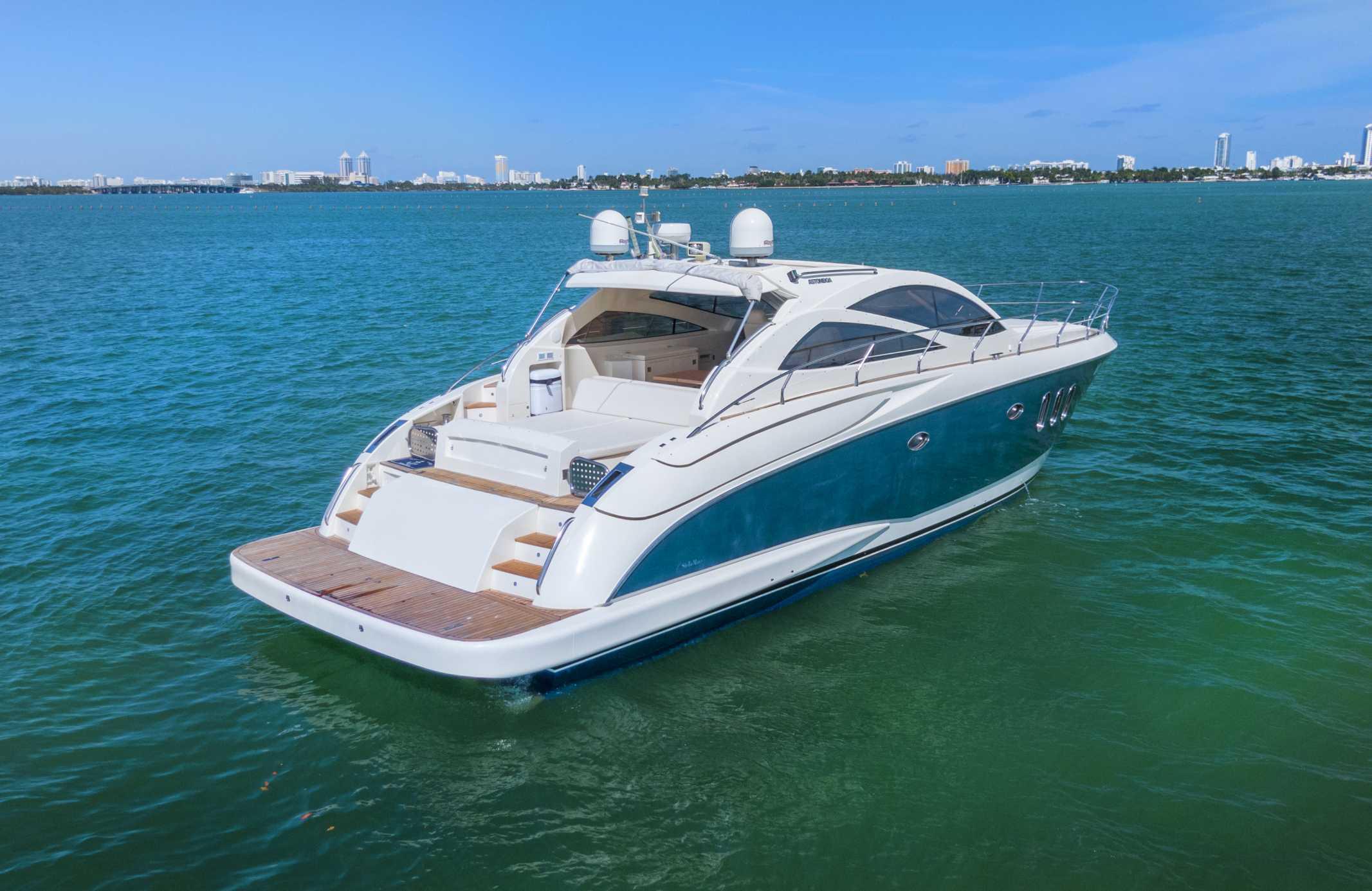 This 55 ft Astondoa is a Spanish built luxury express sport yacht created by the renowned Spanish yard known for building fine quality yachts for over three generations. Astondoa, as a brand, is most notably known for their exceptional craftsmanship and their forward thinking European styling.  This sport yacht has excellent wide open spaces throughout, with two large sun pads for tanning on the front and the back of the yacht.  In this model they created an excellent open concept that affords three large staterooms and an elegantly designed interior with high quality luxury finishes throughout the boat. Rent her for your next Miami yacht charter adventure, climb aboard and let her experienced captain and crew show you the best cruising, swimming and sightseeing areas that Miami and South Beach have to offer.
