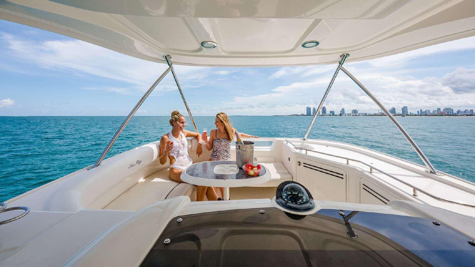 The 58’ Sea Ray Flybridge Motor Yacht is packed with luxury accommodation’s that will make your time spent aboard a very memorable experience! The top deck called the bridge is a great place to enjoy the sights and sip your favorite beverage while cruising the tropical waters of south florida. If it get’s too hot, enjoy the views from the air conditioned salon featuring large windows with 360 degrees views and comfortable leather seating. The lower aft deck is great for dancing and toasting to the good life in Miami aboard this beautiful yacht. This yacht boasts a powerful sound system and a large floating foam island to lounge on while at anchor.