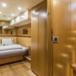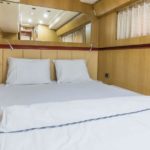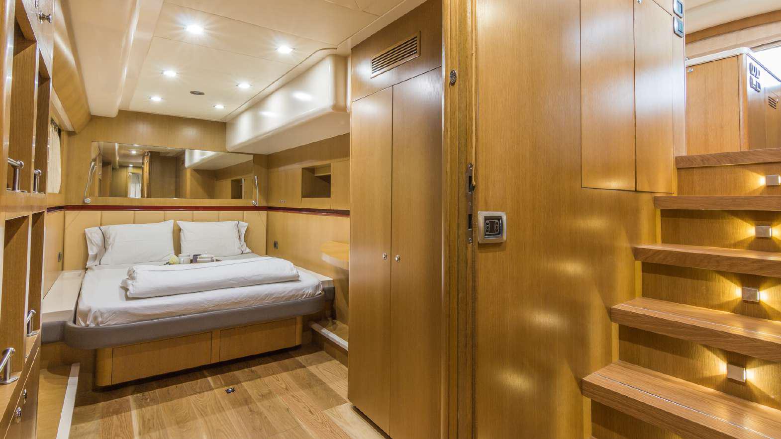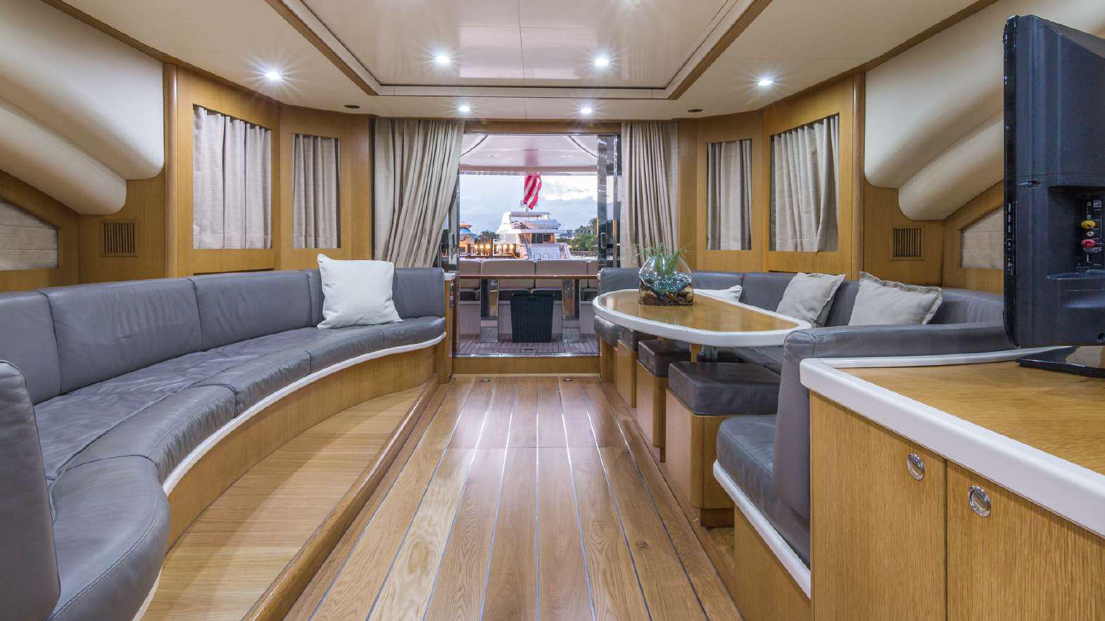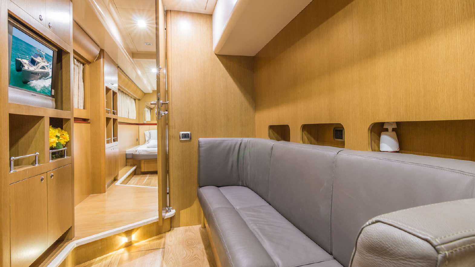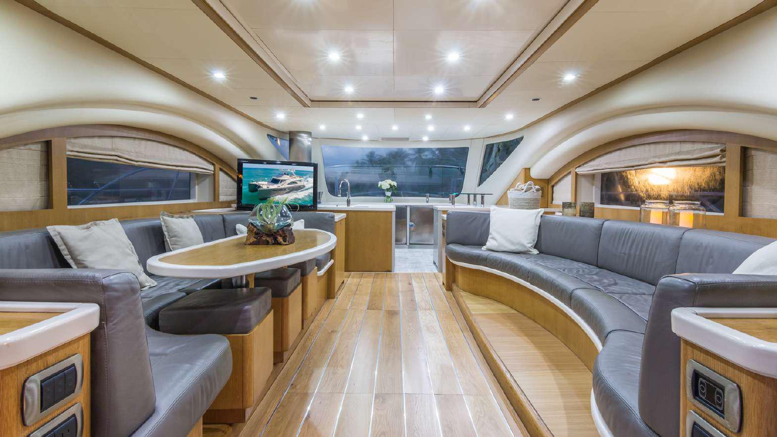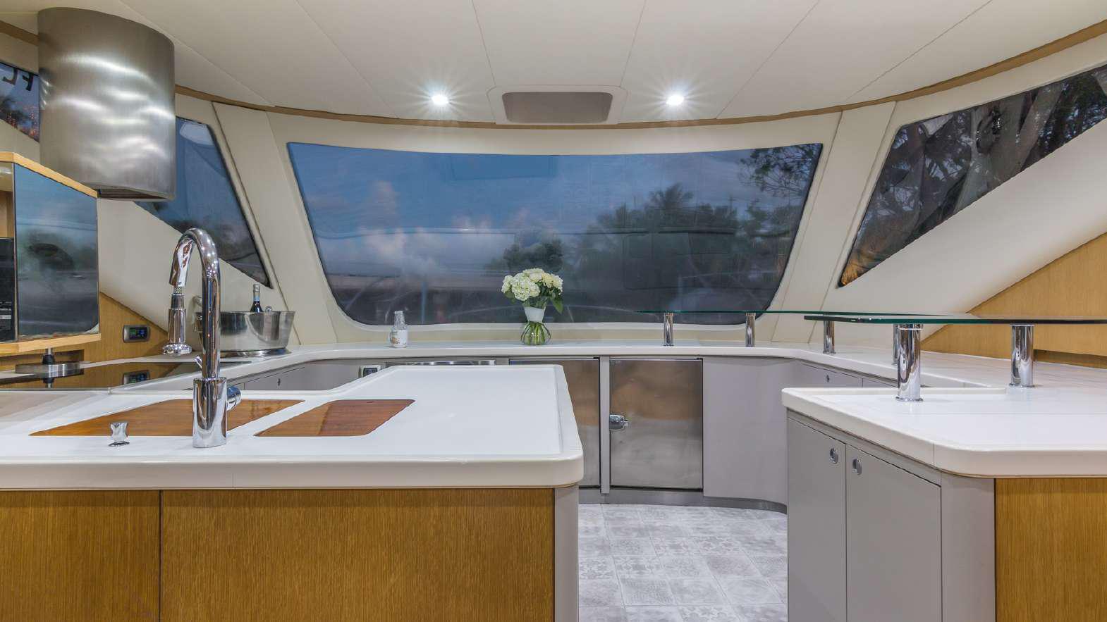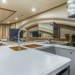 The vessel has a spacious light salon, with a contemporary warm décor. The attention to detail regarding the layout creates a generous feel. The salon offers a large sofa on the starboard side and formal dining to port, with a sofa and large table, forward of which a flat-screen TV provides indoor entertainment. The galley is a full beam of the yacht forward, making it a versatile for simple meals, or larger event catering. Thanks to the elongated side windows, interiors receive amazing natural light.