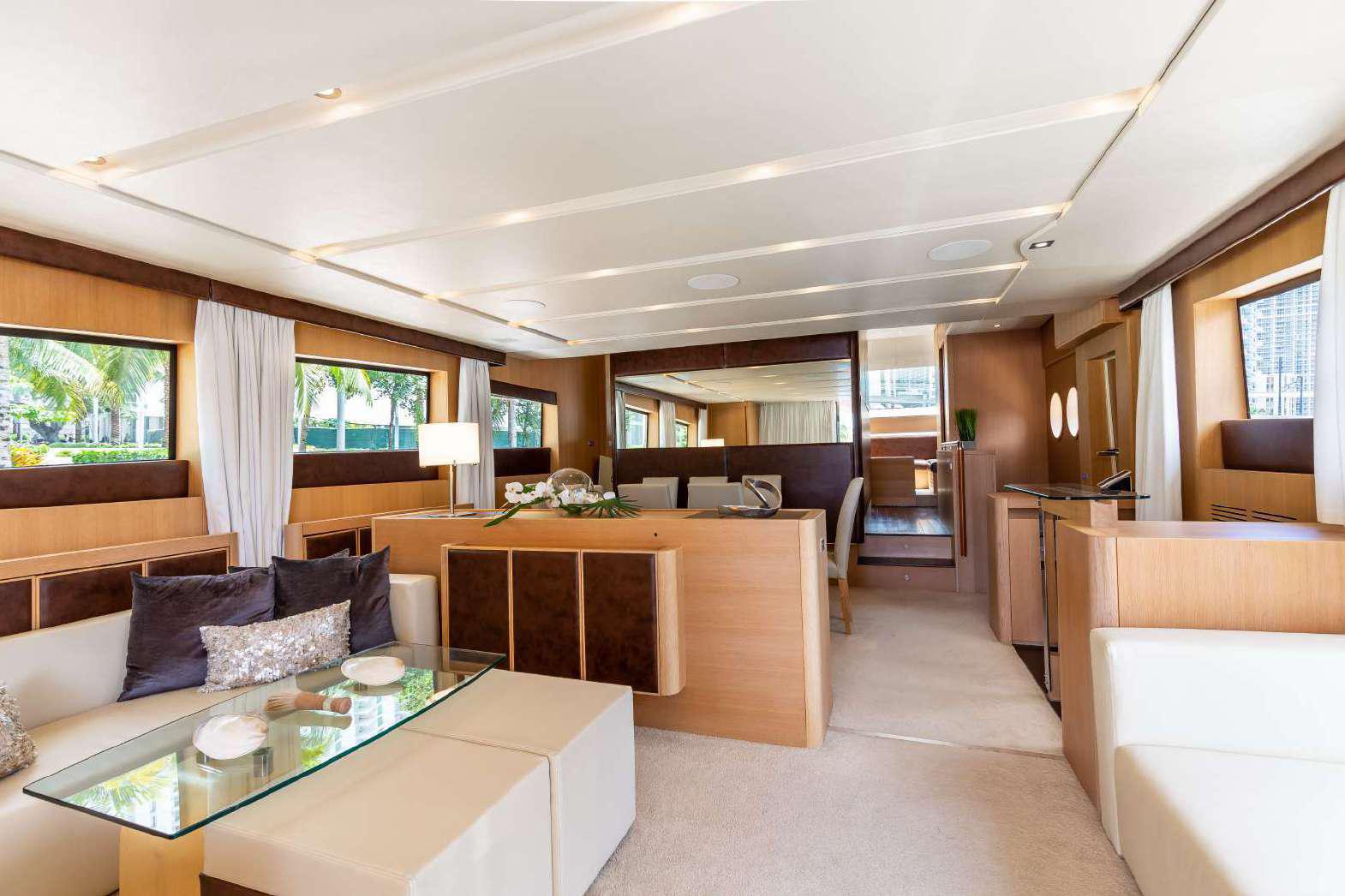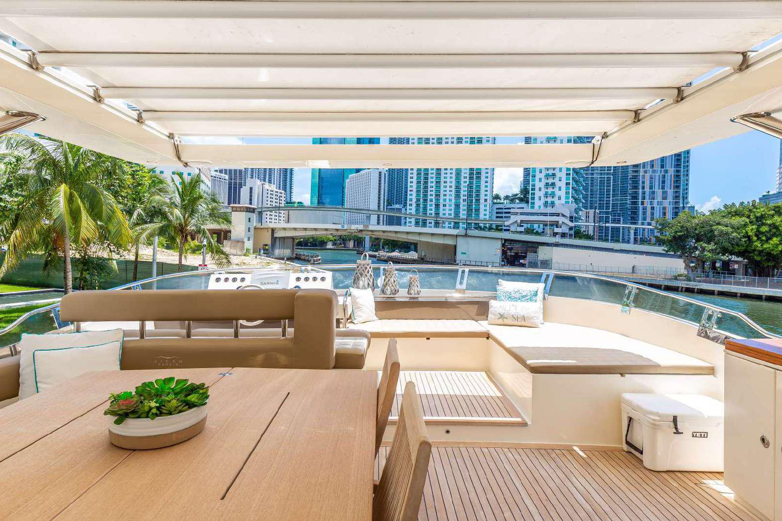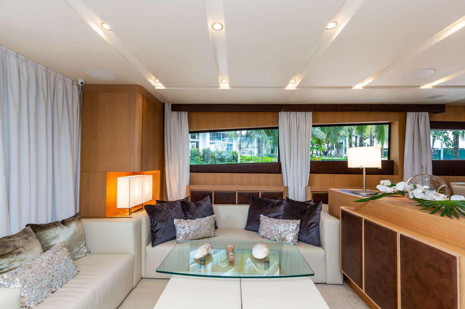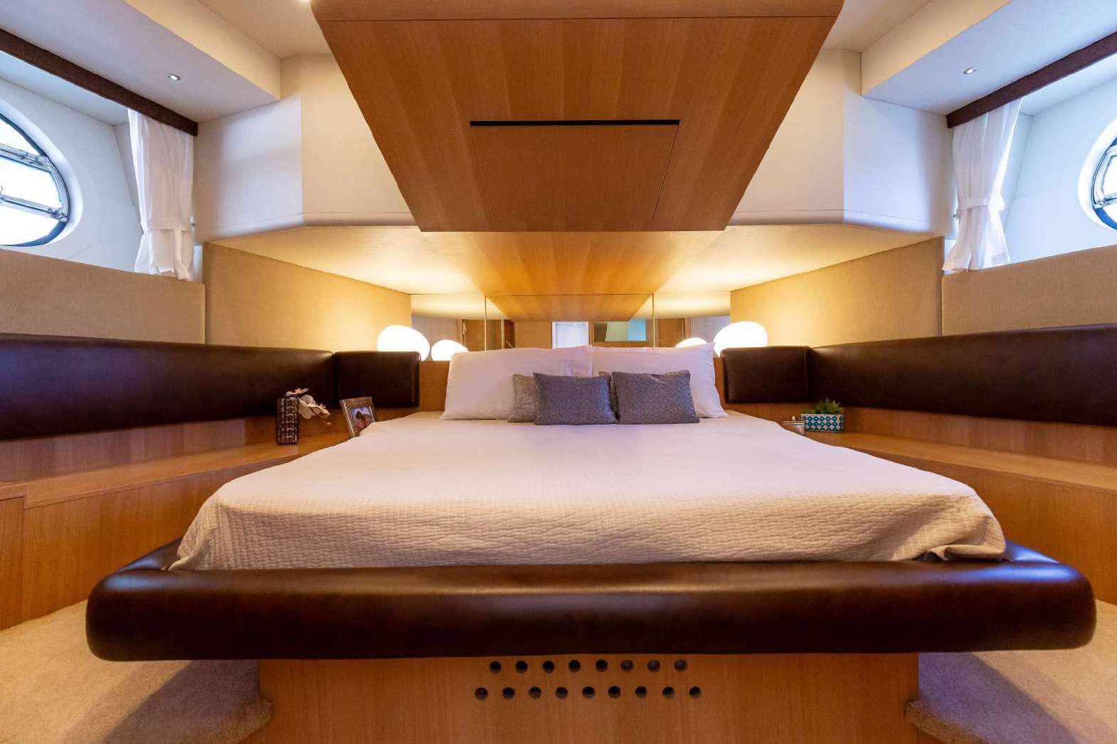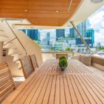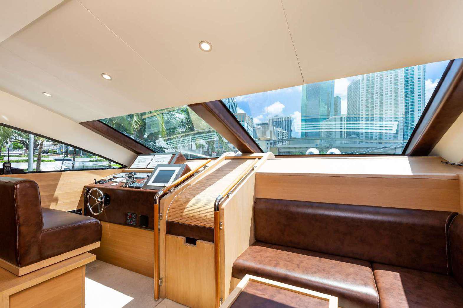 Elegance, power and unmistakable style: these are the principal characteristics of this Aicon Flybridge. This elegant yacht has flowing lines that effortlessly draw the eye, showing the fluidity and the dynamism of the design. The design of the yacht highlights the volume of the airy, geometric spaces that create a harmonious balance between the exterior and the interior resulting in a unique environment, notable for its elegance and its style. The stylish look features details such as large, rounded portholes or the large saloon window that brings you close to the sea.